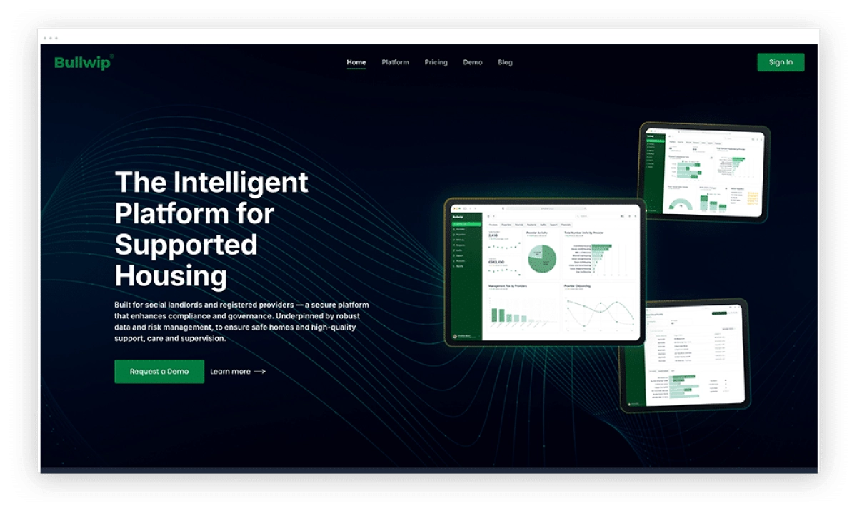 This bespoke SaaS platform website was designed for Bullwip, an intelligent management system built specifically for the supported housing sector.